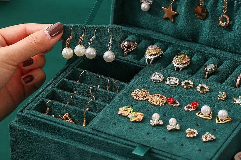 Les trois niveaux de la Boîte à Bijoux en Velours vous permettront de stocker plus de 100 bijoux. Pendentifs, créoles, anneaux et bracelets : ils seront tous soigneusement rangés.